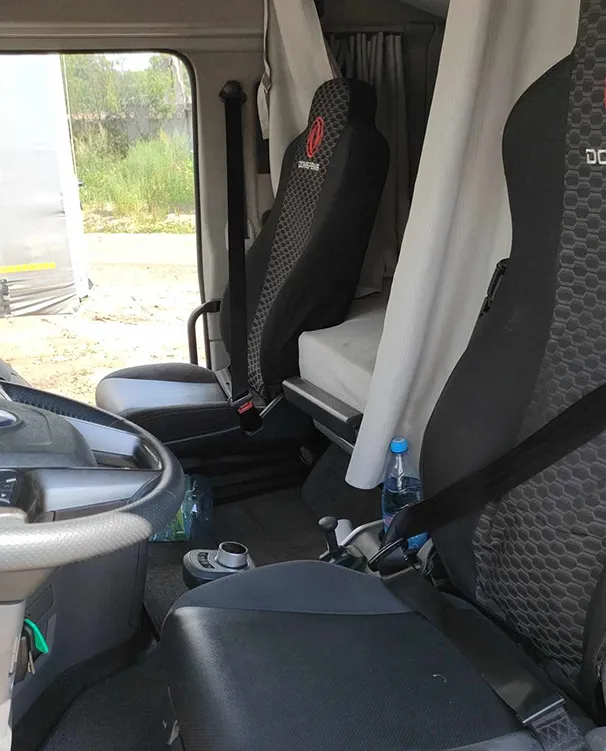 Комплектация включает: пневмоподвеску кабины и заднего моста, тормоза-замедлитель (ретардер), системы безопасности (ESC, ASR, LDWS), комфортную спальную кабину с кондиционером, холодильником и подогревателем. Топливные баки общей емкостью 1100+ л. Полная масса автопоезда — 44 тонны.